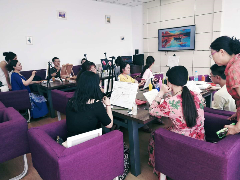 今日,沙龙房间满是新老学员,几乎所有的桌椅已被占满,有颜料、有画架用布框、有我们挥舞画笔的灵巧的手……