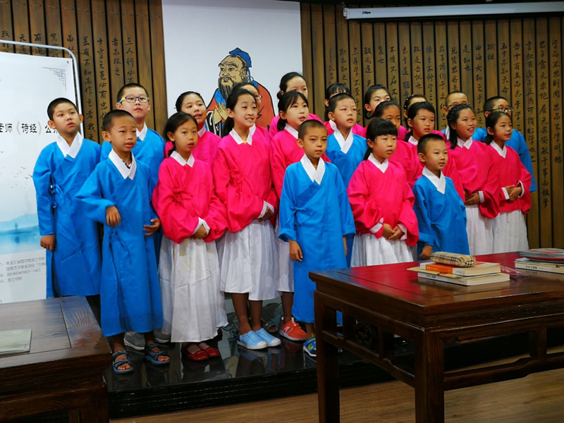 黑龙江省图书馆龙江书院连续六天的“《诗经》公开课”,今天在雅正优美的唱《诗》声中结束了。六天的课程,有新朋、有故交,有花甲之年的老者,有正当盛年的朋友,也有尚在稚龄的孩童,每一个人,都投入地唱出《诗经》之美!无论是传统吟诵调的抑扬铿锵,还是来自古乐谱吟唱的古韵悠远,他们都全力以赴地与每一个音符融入在一起、与每一句诗贴近在一起。因为与音乐紧密相连,即使是来自于3000年前《诗经》的古老诗句,甚至是历史上《诗经》学的繁杂问题,学员们都没觉得有距离感。我讲《诗经》四始、六义、美刺、风雅正变等比较枯燥的内容时,大家也都全神贯注。我拿来的清朝时期的《诗经》课本,孩子们更是特别喜欢,整个课间都在翻看,比大人们兴趣还浓。