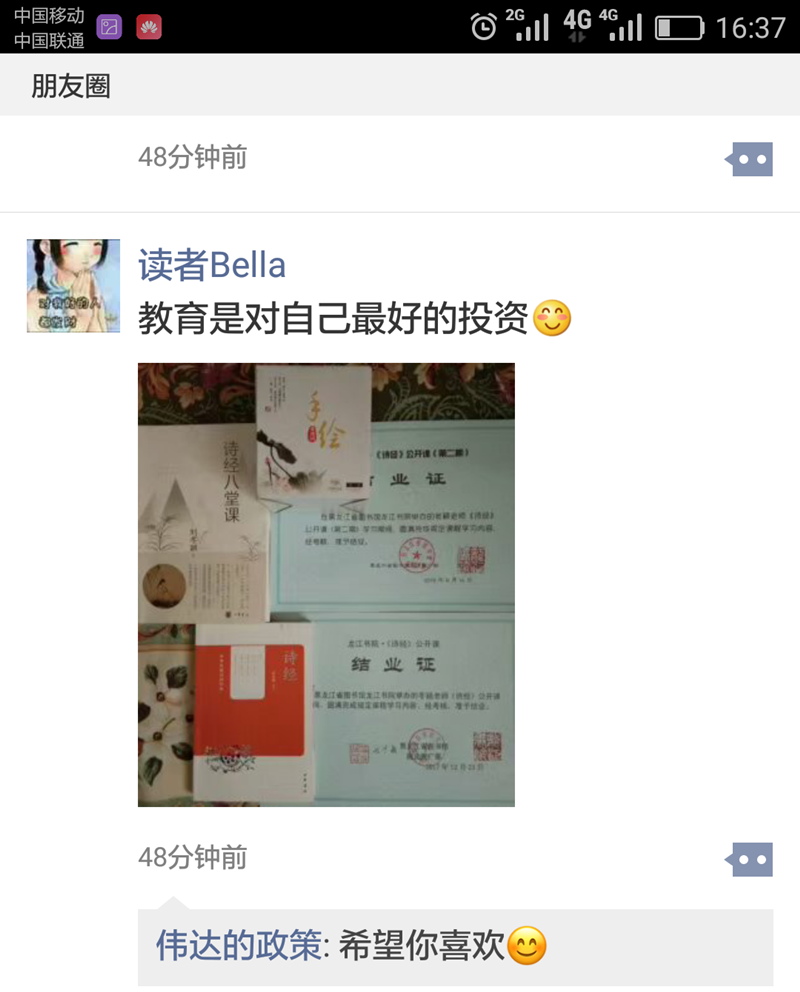 昐望已久的诗经公开课,这么快就结束了,真的让人无限留恋。又开始昐望下一次的课。感谢冬颖、媛媛老师的耐心赐教!感谢王政,石凤老师的精细组织!感谢诗经公开课这个温暖,其乐融融的大家庭!