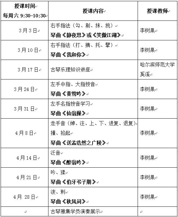 为弘扬中国传统文化、传承古琴技艺,龙江书院与龙江琴社联合开设古琴课程,由龙江琴社社长李树果及其教师团队授课,针对零基础(无需乐理、乐器基础)学员招生。授课内容包括:古琴传统“减字谱”的识读、基础乐理与简谱常识、古琴左右手的基本指法、古琴的选购与保养常识等。欢迎尊重中国传统文化、愿意认真按老师教授的正确弹奏方法学习、课下坚持习练的古琴爱好者报名参加。