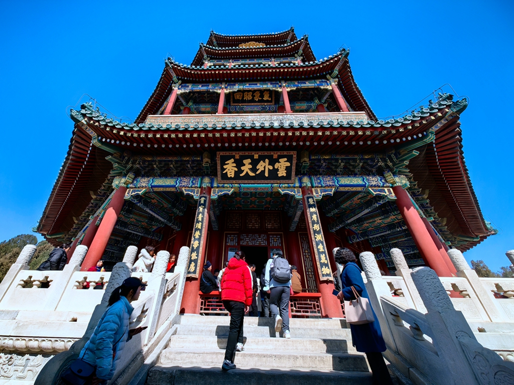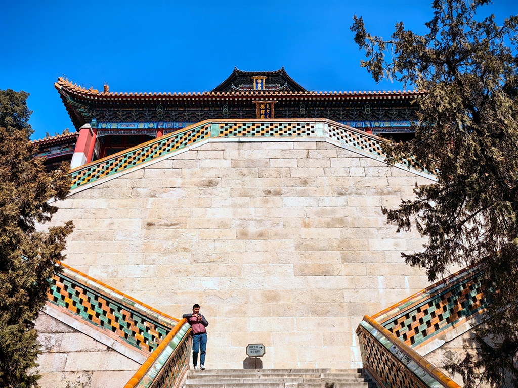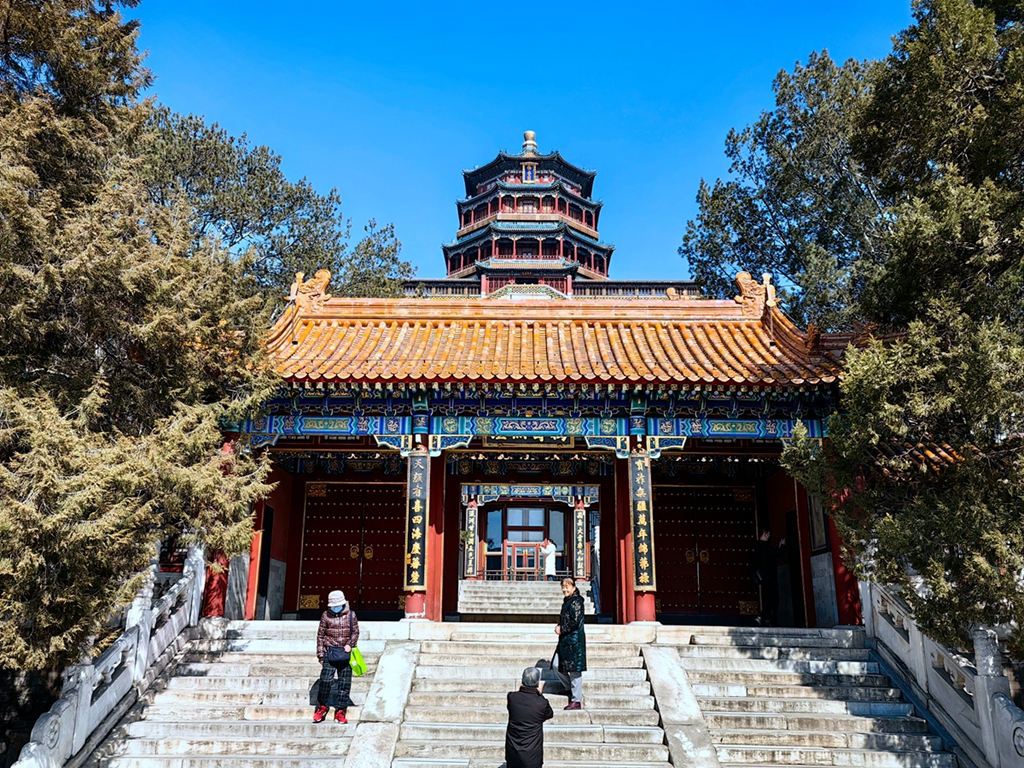 来到颐和园首先映入眼帘的是颐和园的象征和地标建筑佛香阁,它位于万寿山前山的巨大石造台基上,台基包山而建,高达20米。佛香阁实在是太醒目了,霸气的身躯吸引着一切注意力,它的体量和宏伟的气势,统领着颐和园庞大的建筑群,登上佛香阁,昆明湖尽收眼底。