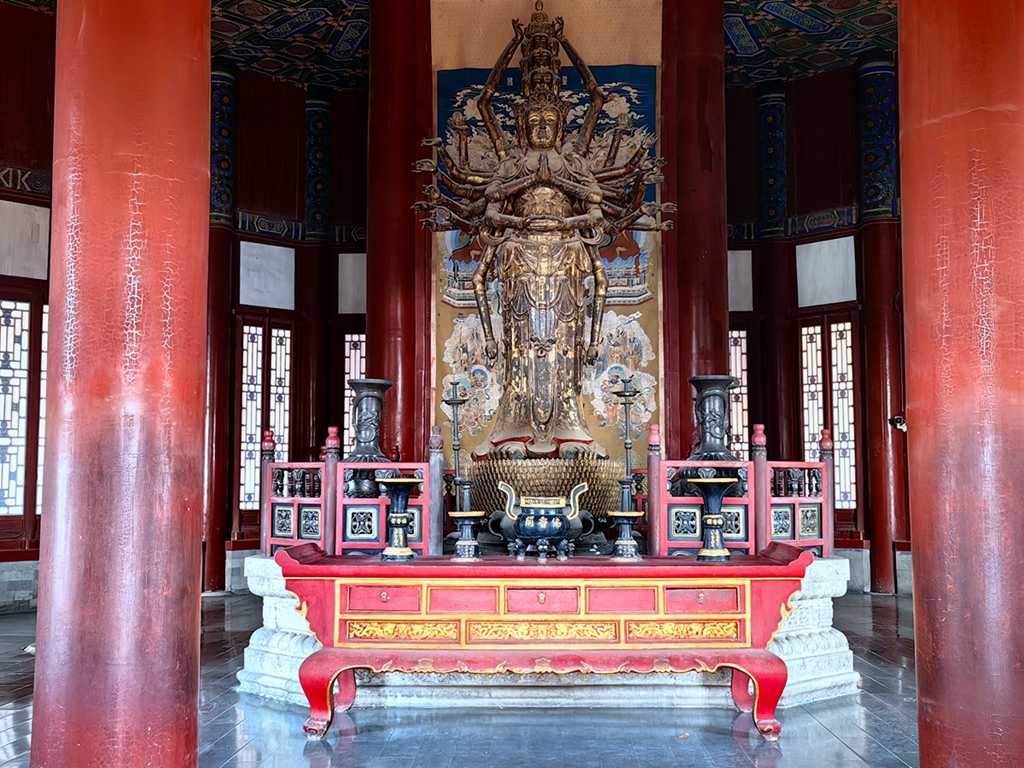 走进佛香阁是开敞高大的空间,正中石雕须弥座上伫立一尊佛像,这佛像颇有来历,故事也十分动人。阁中原来的乾隆木佛毁于英军纵火,光绪时补拆的泥像又毁于文革,现在的这座供奉于西城的米勒寺大悲殿,因为被砌在夹壁墙中才保存下来。