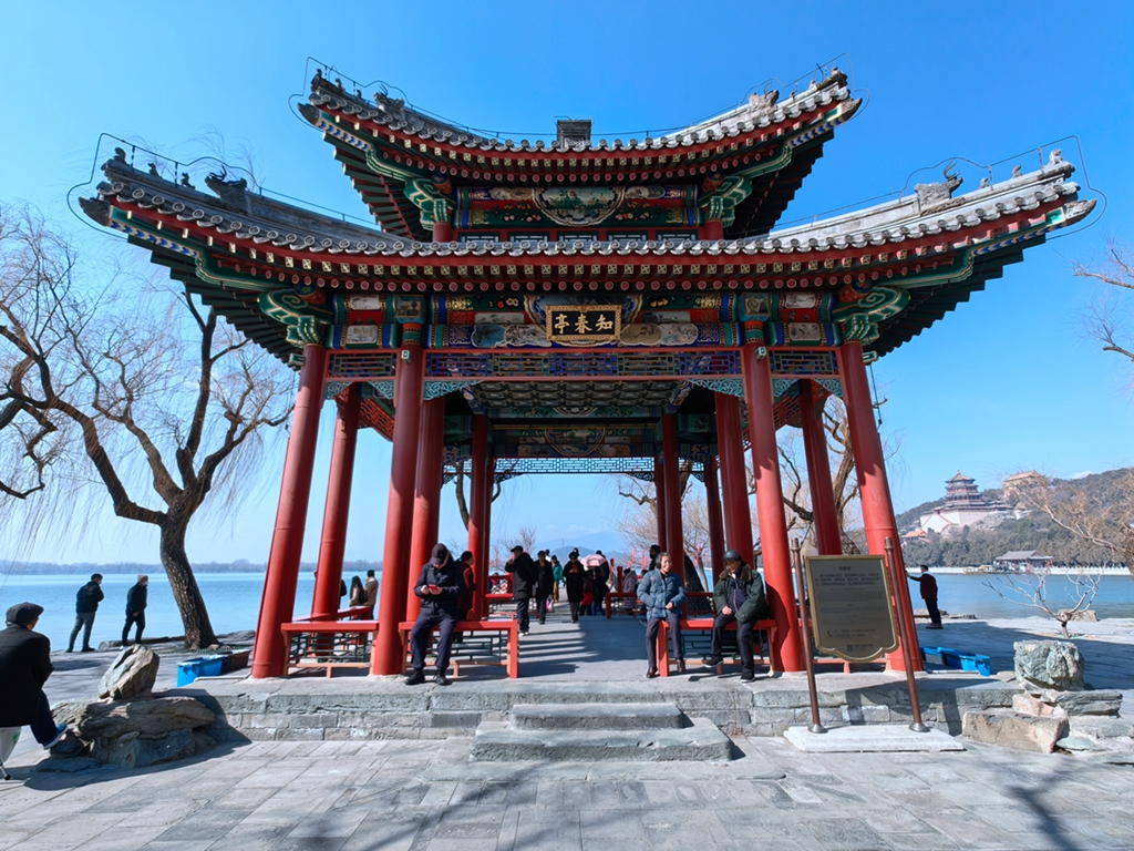 知春亭位于颐和园昆明湖东岸边,亭畔遍植垂柳,春来景色殊胜,亭边垂柳依依,这里也是饱览万寿山昆明湖全景的极佳观景点,每年春天昆明湖解冻总由此处开始,所以取名知春亭。知春亭坐东朝西,悬挂慈禧书“知春亭”匾,建筑风格华丽精致。
