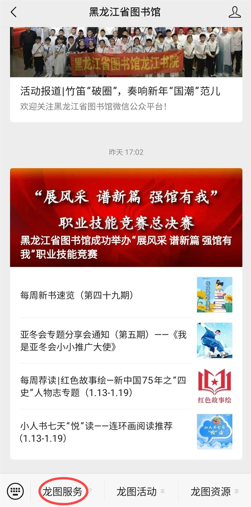 一、打开微信搜索、关注“黑龙江省图书馆”公众号。