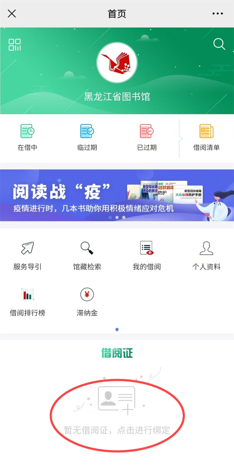 二、点击“龙图服务”,进入微服务大厅后,点击“暂无读者证,点击进行绑定”