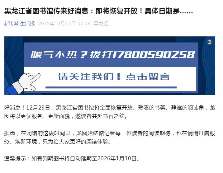 黑龙江省图书馆传来好消息:即将恢复开放!具体日期是……12-16/ 2025