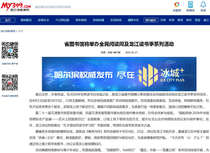 22项活动陆续展开 黑龙江省图书馆将推出全民阅读周及龙江读书季系列活动03-27/ 2026 -