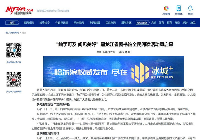 “触手可及 阅见美好”黑龙江省图书馆全民阅读活动周启幕04-20/ 2026 -