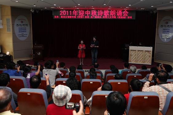 在小提琴和钢琴优美乐曲的伴奏下,诗歌朗诵会拉开了序幕。一首首中外经典诗歌,通过朗诵者肢体语言的配合,将听众渐渐带到诗文的意境之中。很多诗人将自己的原创作品也同时展现给大家,自创自诵把感情抒发的淋漓尽致,常常博得全场热烈的掌声。在朗诵徐志摩的《再别康桥》后,又加以英文版朗诵。俄罗斯普希金的名诗《我曾经爱过你》也以中俄两种语言朗诵,更加展示了不同语言的诗歌魅力。朝鲜族、蒙古族的朗诵者穿着民族的服装,更增加节日欢乐的气氛,体现着民族大家庭的和谐。主办者组织了中外诗歌及诗人原创的作品21首,在朗诵进行中,现场自发要求上台参加活动的非常踊跃,组织者不得不最后挑选6名诗歌爱好者追加到朗诵节目之中。