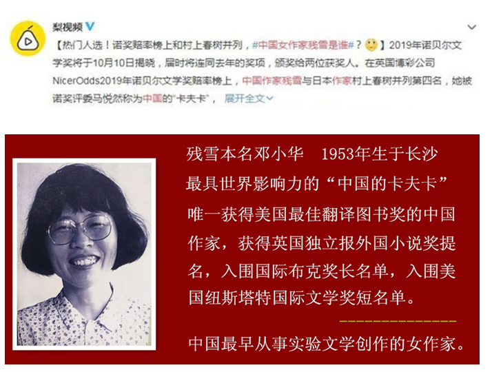 她,诺贝尔文学奖夺奖热门、微博热搜榜阅读量近2亿,并与村上春树齐名;成为中国最被看好的诺贝尔文学奖提名人选;一位被世界认知的具有先锋气质的中国女作家——残雪。
