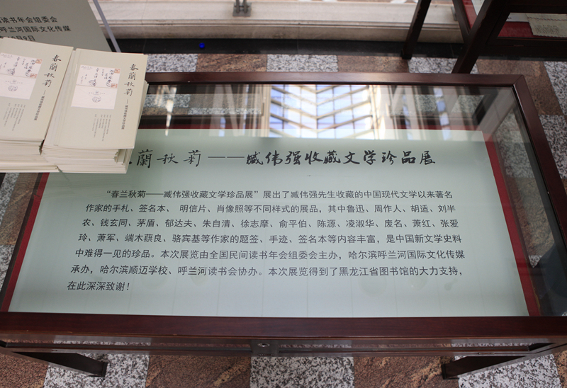 2019年10月9日,由全国民间读书年会组委会主办的“春兰秋菊——藏伟强收藏文学珍品展”,在黑龙江省图书馆二楼展区展出。