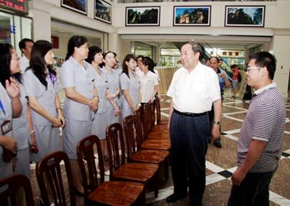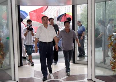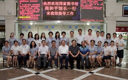 7月20日下午,在哈尔滨出席全国文化厅局长工作会议期间,国家图书馆馆长周和平同志在黑龙江省文化厅副厅长宋宏伟同志的陪同下,冒雨到我馆视察指导工作。这是周馆长第二次视察我馆,在与我馆职工亲切交谈后,与全体中层干部合影留念。