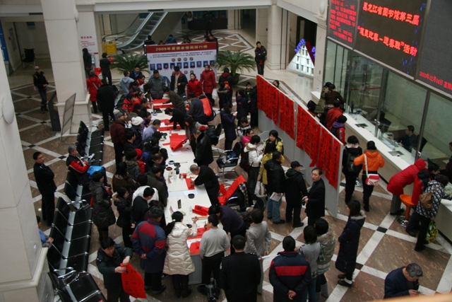 “笔墨迎春——送春联”活动至今已经连续举办了三届,始终受到读者的热烈欢迎。今天高歌、王显君、王有喜、吕守堃、程义山、金山人等知名书画家齐聚我馆,为广大读者送来了早春的美好祝福。近百位读者早早来到活动现场,每一位书法家的面前都排着长长的队伍。书法家们更是不予余力,他们非常热忱地迎接每一位前来参加活动的读者,并用他们的妙笔将那些最吉祥的话语呈现在读者的面前。
