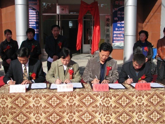 省图书馆副馆长刘继维、黑河市文管会主任潘忠林、逊克县文体局副局长于俊庆、逊克县图书馆副馆长马明泽签订黑龙江省图书馆流动分馆建设协议书
