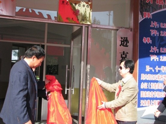 省图书馆副馆长刘继维、逊克县委常委、宣传部部长刘晓东为“黑龙江省图书馆逊克流动分馆”揭牌