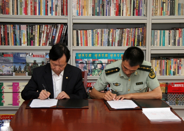 副馆长刘继维、警卫连连长门立新签订《黑龙江省图书馆流动站建设协议书》
