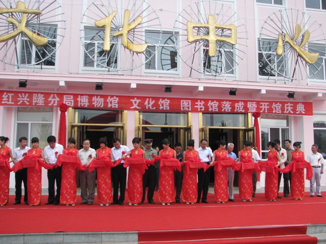 省图书馆馆长高文华、农垦忠局冯局长及红星隆农场领导为红星隆分局三馆一中心剪彩