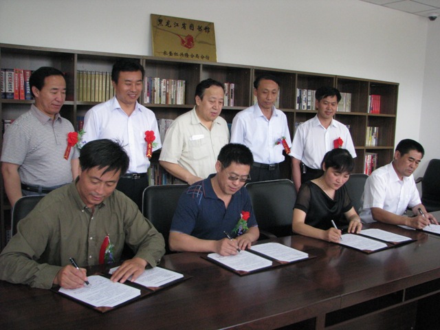 红兴隆分局文体局副局长王霞、红星隆分局文体局科长宋鹏签订红兴隆分局流动分馆协议书