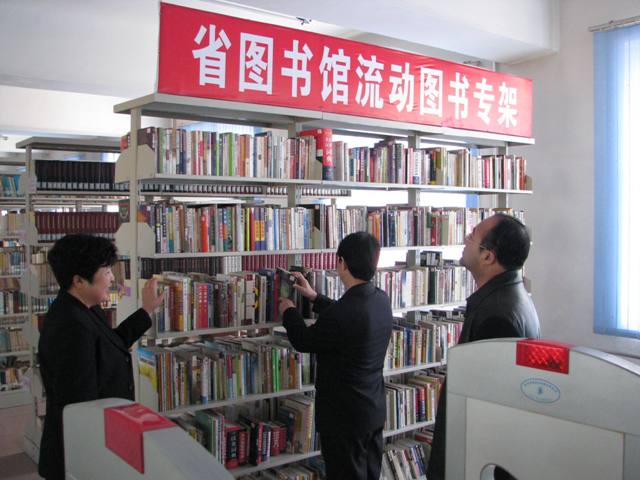 黑龙江省图书馆副馆长刘继维、绥化市文管站副站长董庆鹏参观已经上架的望奎流动分馆图书专柜