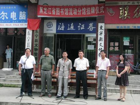 省图书馆高文华馆长在挂牌仪式上致辞,他说:“流动图书馆建设是省馆拓展延伸服务的一个重要组成部分。加强基层图书馆文献信息资源的建设和发展,就是为了更好地丰富东宁县图书馆文献资源,提高东宁县图书馆服务质量和服务水平,相信黑龙江省图书馆东宁分馆的建立,会为东宁县政府和广大人民群众提供更好的智力支持和精神动力,为东宁县的经济社会发展、旅游文化发展、公共文化发展增添新的推动作用。”东宁县人民政府副县长张富广在讲话中说:“今天省图书馆流动分馆在东宁图书馆正式建立挂牌,我们感到无比地高兴,这是我县图书馆事业发展史上的一件大事。在我县图书馆史上是绝无仅有的,也是史无前例的。我们相信有各级领导的关心指导,有社会各界的大力扶持和帮助,我们的图书馆事业一定会蓬勃发展,流动分馆的建设也一定会兴旺发达。”