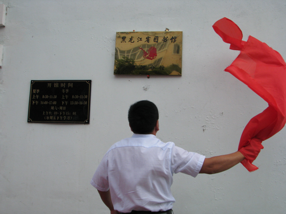 姚龙部长为黑龙江省图书馆黑河流动分馆揭牌。王彦杰副区长主持了挂牌仪式。