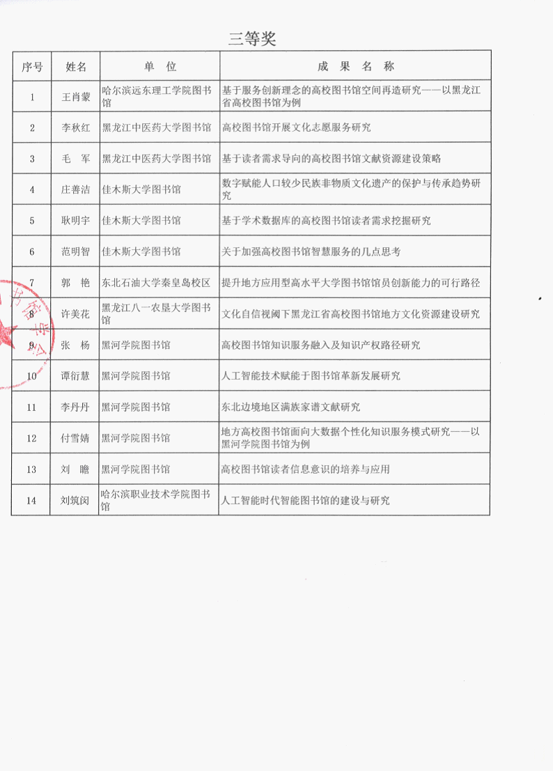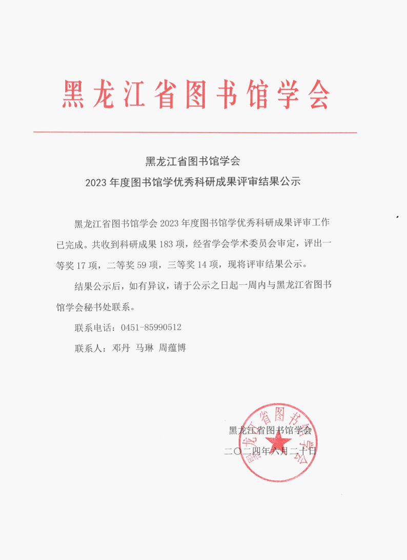 黑龙江省图书馆学会2023年度图书馆学优秀科研成果评审结果公示