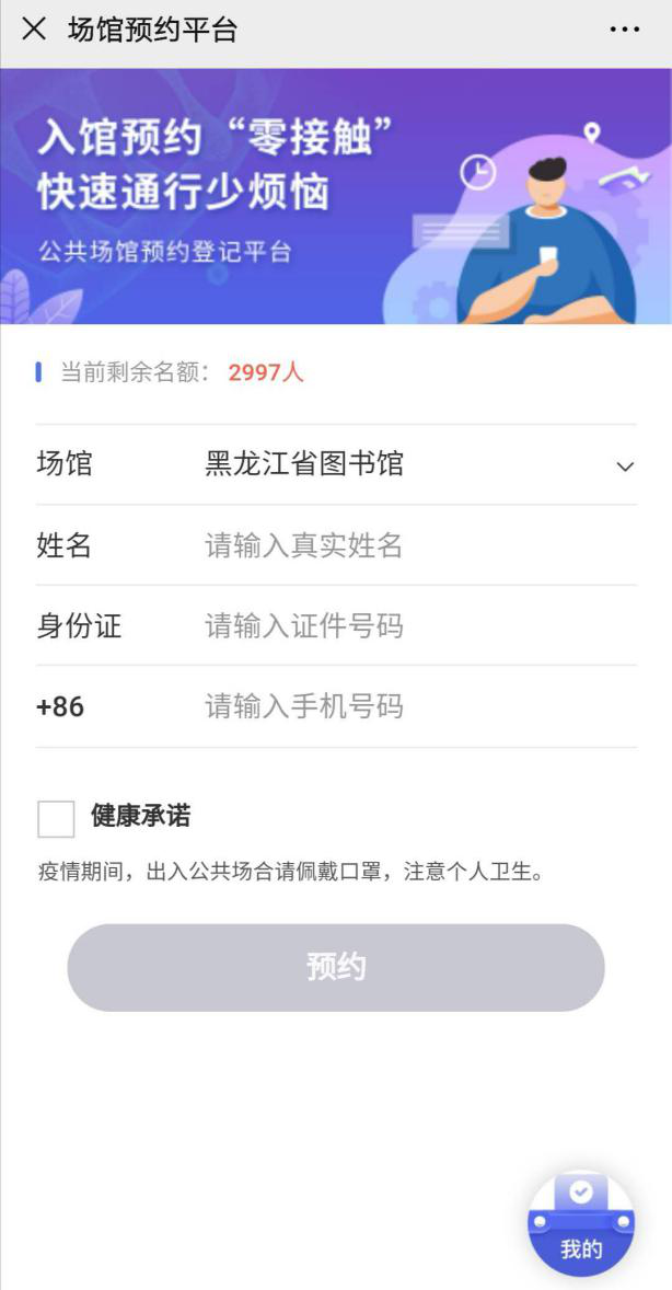 第二步:点击“龙图服务”下的“预约入馆”,输入真实姓名、身份证号、手机号并确保身体健康后点击“预约”;