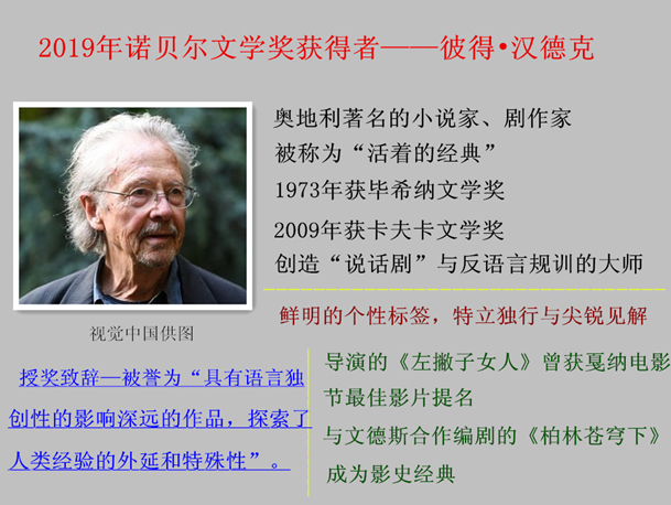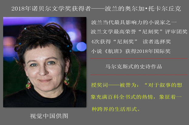 一年一度的诺贝尔文学奖发布公告,波兰作家奥尔加?托卡尔丘克(Olga Tokarczuk)和奥地利作家彼得?汉德克(Peter Handke)分别摘取2018年、2019年诺贝尔文学奖的桂冠。
