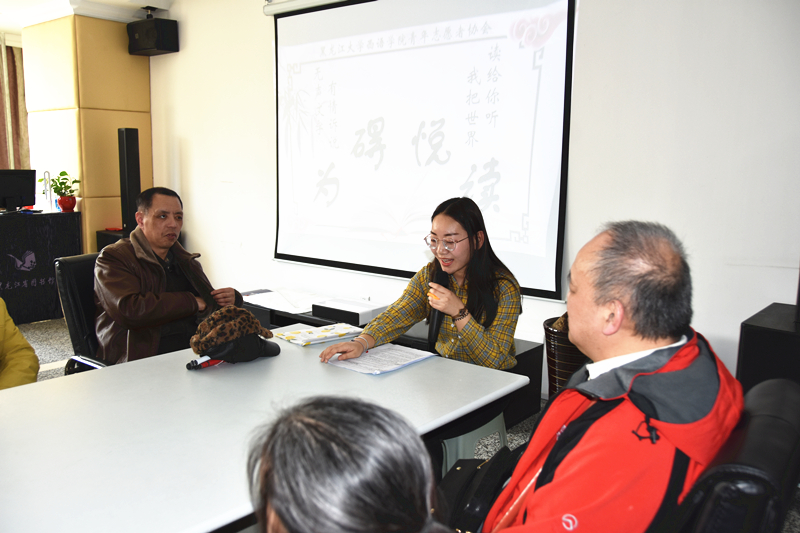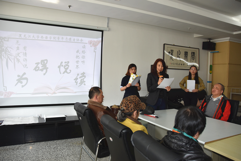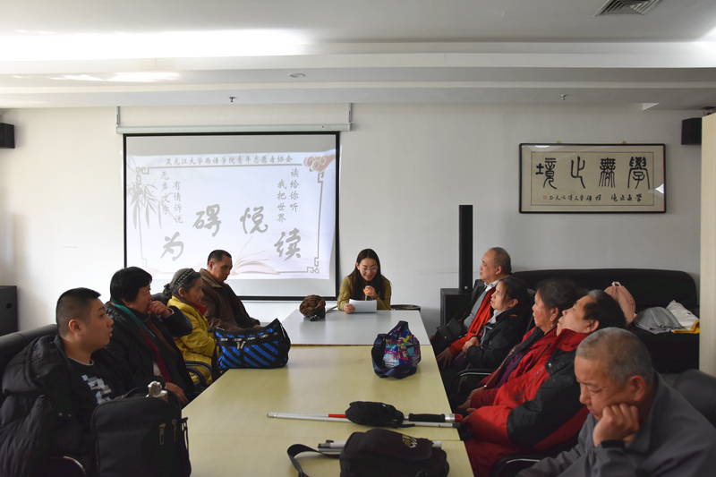 阅读不仅可以愉悦自己,还能温暖他人。今天是无障碍服务部视障读者活动日,为进一步深入开展全民阅读活动,使阅读走近视障群体。黑龙江省图书馆无障碍服务部联合黑龙江大学西语学院青年志愿者协会共同组织开展了为碍悦读——我是你的朗读者活动。我们希望通过志愿者的讲解和引领,不仅让视障朋友欣赏经典美文佳作,还能对当前社会的热点、焦点,世界各地文化、名胜古迹,以及和他们密切相关的法律法规等方面的内容有所了解。同学们将本着“奉献,友爱,进步,互助”的志愿精神,结合学院专业特点,用声音和知识与视障读者搭建交流理解的桥梁,力争用真诚、关爱、细心让视障朋友的精神世界更加丰富多彩。今天同学们为大家带来了《平“语”近人——习近平总书记用典》中的十八洞村“精准扶贫”、总书记梁家河修建第一口沼气池和总书记弘扬焦裕禄精神,这三个小故事让视障读者听的津津有味。同学们还把刚刚闭幕的两会的热点新闻以及三﹒一五食品安全等与大家交流分享。下一期为碍悦读定于4月26日(周五)10:30进行,为大家带来《老年人权益保障法》的相关内容。