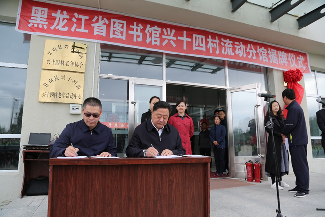 金秋九月,秋高气爽,硕果累累。2018年9月21日上午,黑龙江省图书馆第一家村级分馆兴十四村分馆揭牌并正式开馆投入使用。黑龙江省图书馆馆长高文华、副馆长张大尧、甘南县政府副县长何伟英、甘南县兴十四村党委书记付华廷、兴十四村的全体党员干部及学生等出席了落成仪式。
