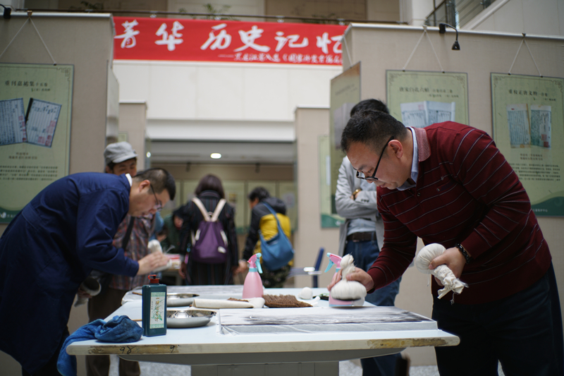 4月23日上午9:00,工作人员还在布置展示现场,有兴趣的读者就已经提前到达,围在桌边好奇的向修复师问这问那。修复师们从使用的工具开始聊起,修复技术、修复用纸一直到指导读者亲身实践。修复师张丹玫展示的是修补书叶,她从古籍破损原因开始和爱好者们说起,然后现场演示修复一叶破损古籍。看着刚刚还破烂残损的书叶慢慢被修复,爱好者们都很惊叹。修复师赵启东和胡光耀展示的是拓片技法,充满趣味性的制作过程和精美的制成品让修复爱好者们热情高涨,纷纷要求自己动手实践,制作好后还兴奋的拿着作品与修复师合影。