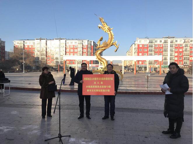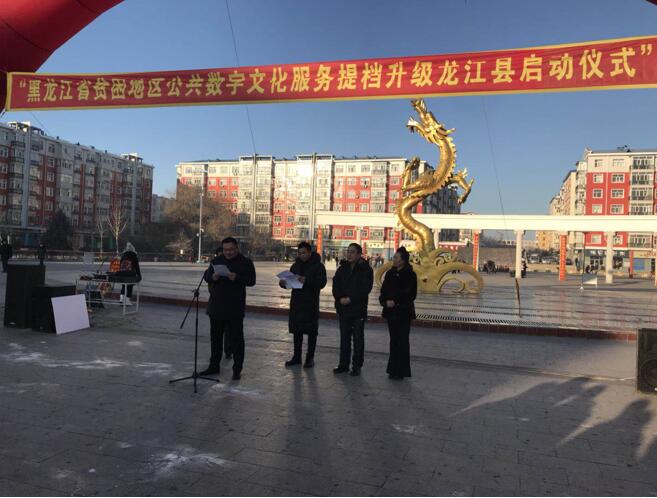 “中西部贫困地区公共数字文化服务提档升级项目”是文化部“十三五”期间重点文化精准扶贫项目。2017年12月27日,黑龙江省贫困地区公共数字文化服务提档升级龙江县启动仪式在志刚广场举行。黑龙江省图书馆副馆长张大尧、龙江县副县长王友良、文化广电体育局局长傅贵彬、副局长王敏等出席仪式。领取设备的各乡镇长和部分贫困村的村长等参加了启动仪式。