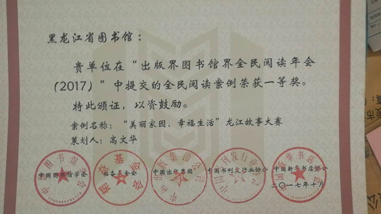 2017年11月9日,由中国图书馆学会、韬奋基金会、中国出版集团公司等主办的“出版界图书馆界全民阅读年会(2017)”上,黑龙江省文化厅主办、黑龙江省图书馆承办、高文华馆长策划的“‘美丽家园、幸福生活’龙江故事大赛”荣获全民阅读案例一等奖。本届年会以“阅读推广与服务效能提升”为主题,出版界、发行界、图书馆界、学术界嘉宾300余人参会。