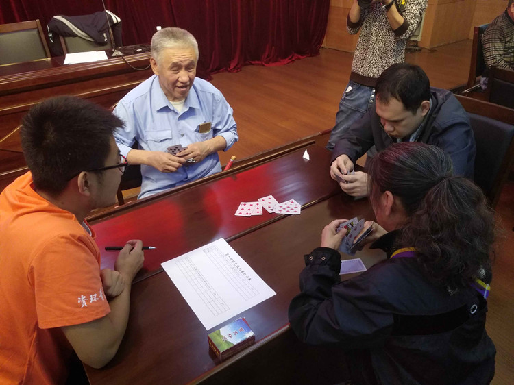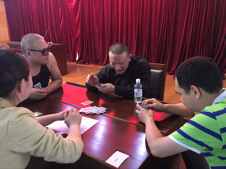 本次比赛的项目为扑克牌,盲人斗地主。盲人选手有27人,分成9组,进行三轮淘汰赛。盲人打牌,全靠自觉,非常讲诚信。洗牌时,正反两面混淆觉察不到,拿第二墩牌第一张的是“地主”。出牌时,全凭手指一张张审辨,但从不出错。一人出牌时,其余两人从不检查是否夹带和打假牌。盲人打的牌,每张牌的一头都用锥笔写了盲文。最终,经过激烈角逐,共产生1名棋牌冠军、2名棋牌亚军、3名棋牌季军。
