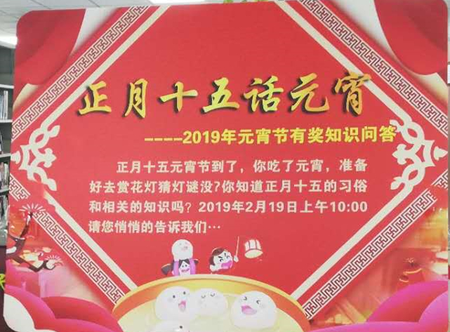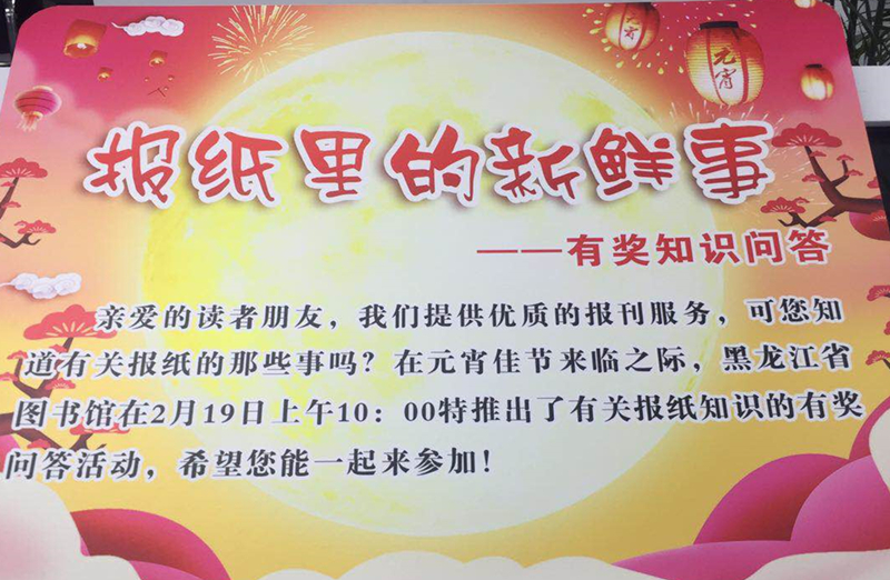 为营造欢乐祥和的节日氛围,弘扬中国优秀的传统文化,黑龙江省图书馆在报刊阅览室、保存本阅览室和中文书刊借阅室共同举办了欢天喜地闹元宵—有奖知识问答系列活动。小伙伴们嗨起来,一起来体验这波年味吧!