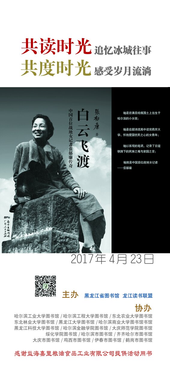 为传承优秀地域文化、弘扬龙江地方文明、推进全民阅读,黑龙江省图书馆以地域精品文献《白云飞渡——中国首位战地女记者张郁廉传奇》为2017年阅读推广活动主线,特别围绕此书设计了系列阅读推广活动。通过深入挖掘书中人物故事、历史背景、建筑素材,激活书中文字,追寻先人足迹,唤醒城市记忆。