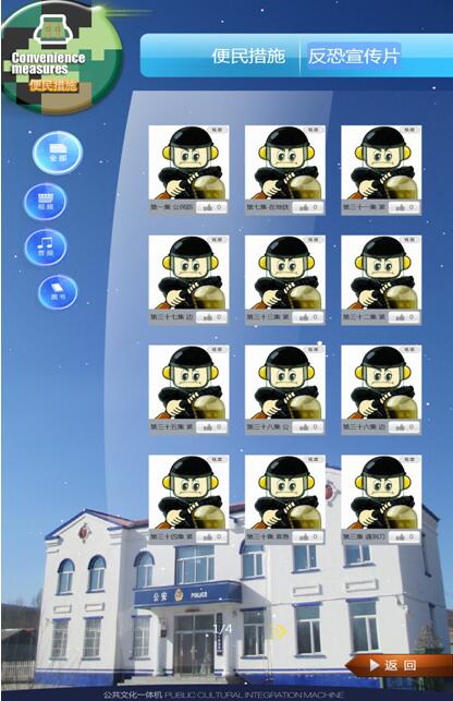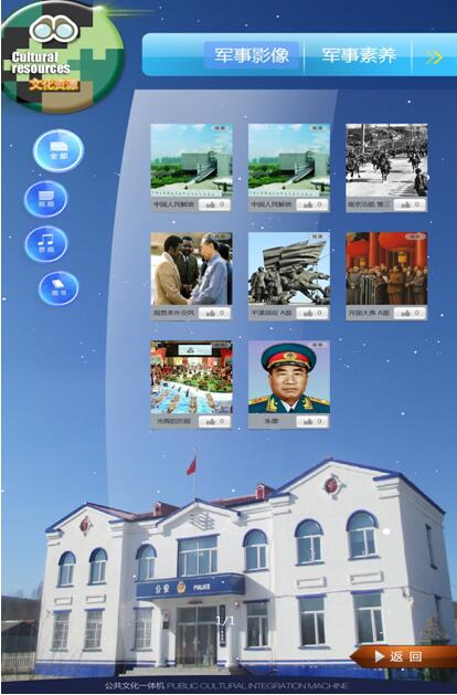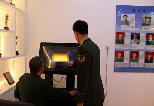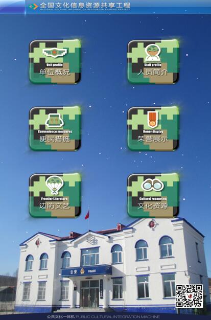 为使公共文化一体机彰显个性,21个基层所队将各单位的营区正面照片设置成主页面背景,增强了服务过程中的体验感。统一制作具有边防特色的迷彩绿Q版图标,活泼的卡通图标和文字的双重标识,既展示了警营特色,又灵动、直观便于操作。在积极宣传推广的同时,综合广大官兵及辖区群众使用一体机的意见和建议,将一体机中原有的边疆文化、军营文化等六个模块进行了科学整合,统一设置为单位概况、人员简介、便民措施、荣誉展示、边防文艺、文化资源六个全新模块。基层单位概况、人员简介和便民措施三个模块为辖区群众提供了快捷的查询服务,“单位概况”介绍了派出所担负的职能范围;“人员简介”便于民众了解责任区民警的基本情况、联系方式;“便民措施”提供了户籍业务办理、公安机关办案程序等服务信息。通过人机交互功能,提升了便民服务水平;“荣誉展示”模块中一张张奖状、一座座奖杯、一枚枚奖章以及荣誉背后的故事,展现了边防官兵为维护辖区治安稳定、服务地方经济发展、拥政爱民等方面付出的辛勤努力和汗水。“边防文艺”模块收集了新闻媒体报道边防部队的视频资源、官兵们拍摄制作的微电影等内容,如《鹤岗边防支队之歌》等,先进典型与模范人物既激励着官兵,又感染着民众,体现了军民的鱼水深情。“文化资源”容纳了知识与趣味,丰富了广大群众与边防官兵的生活及精神世界。现已有近万人次使用了个性化功能模块。