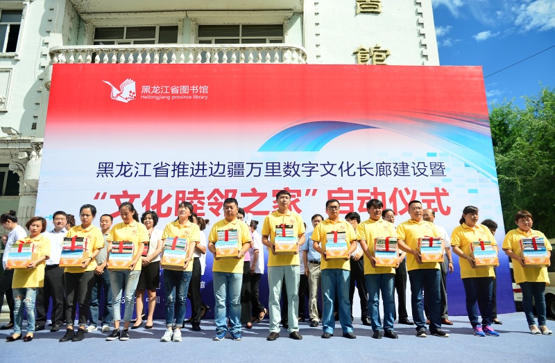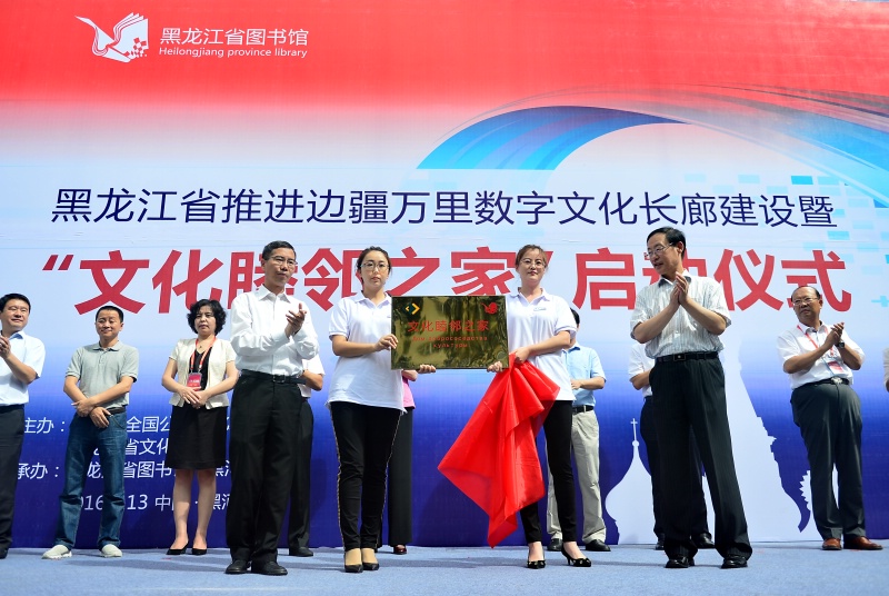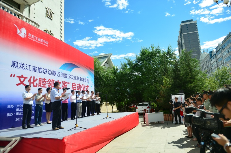 2016年8月13日上午10:00“黑龙江省推进边疆万里数字文化长廊建设暨文化睦邻之家启动仪式”在黑河图书馆举行。来自文化部、全国公共文化发展中心、黑龙江省、吉林省、辽宁省、内蒙古文化厅的领导及黑龙江省图书馆、黑河图书馆、黑河地区基层文化工作者参加了启动仪式。