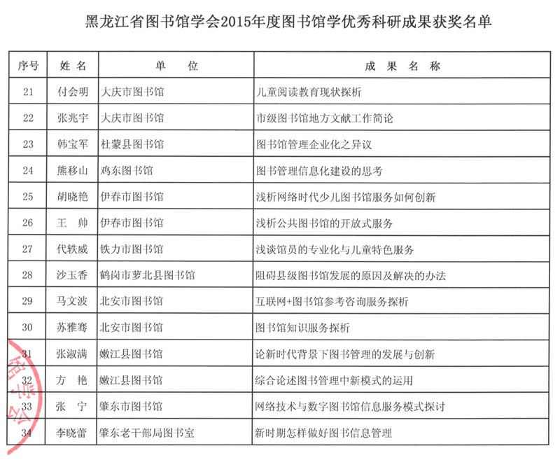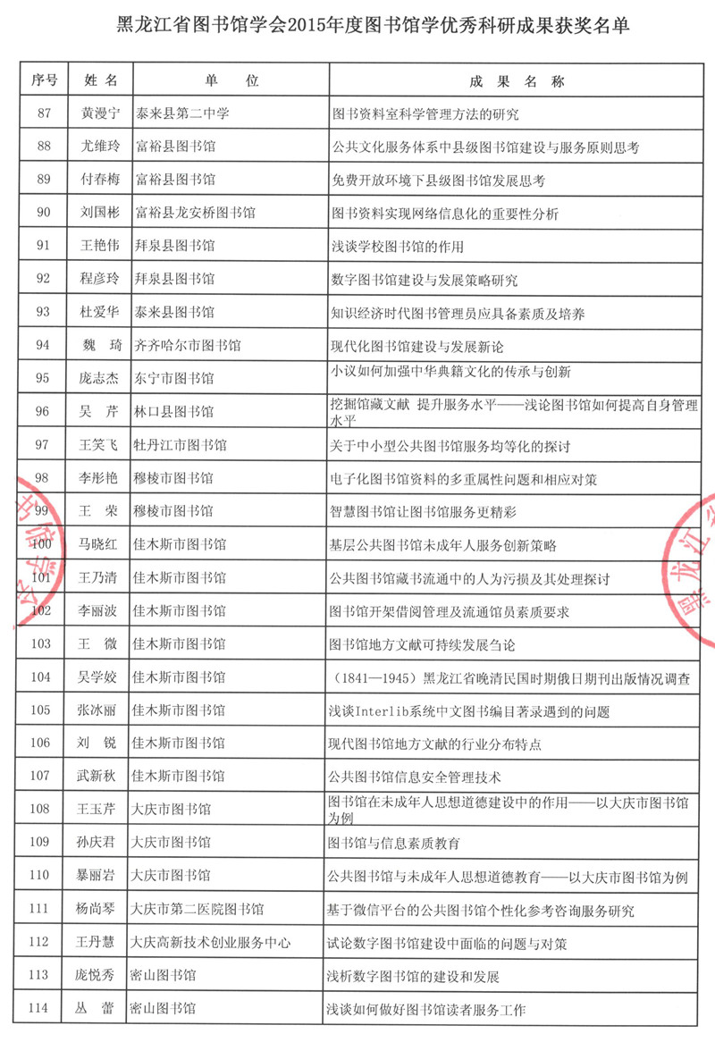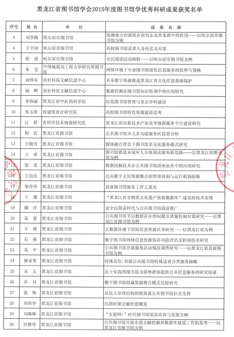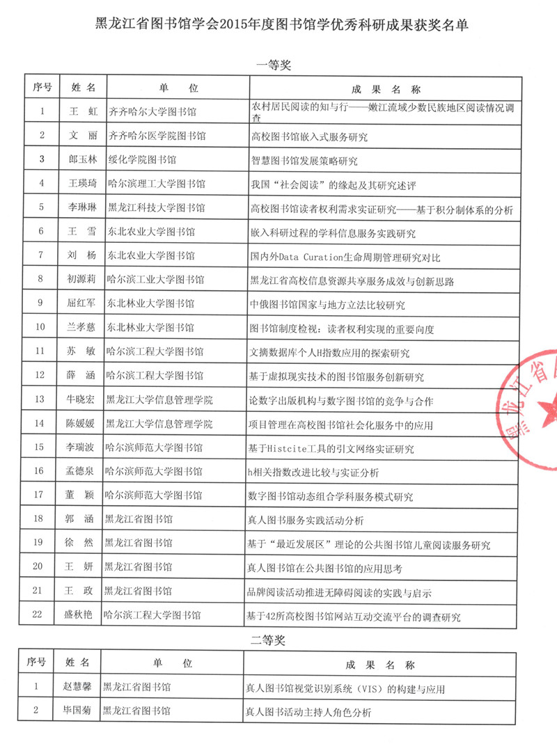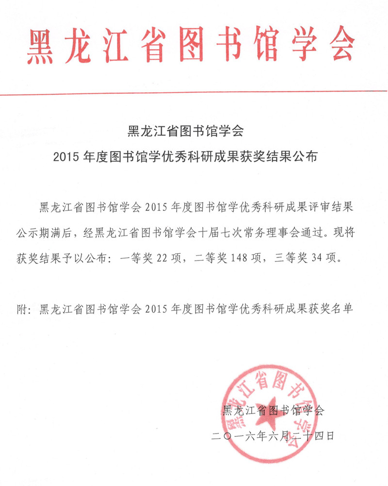 黑龙江省图书馆学会2015年度图书馆学优秀科研成果获奖结果公布