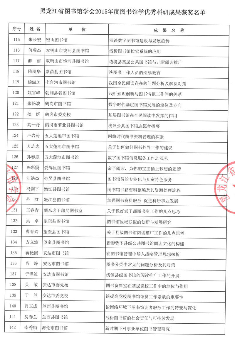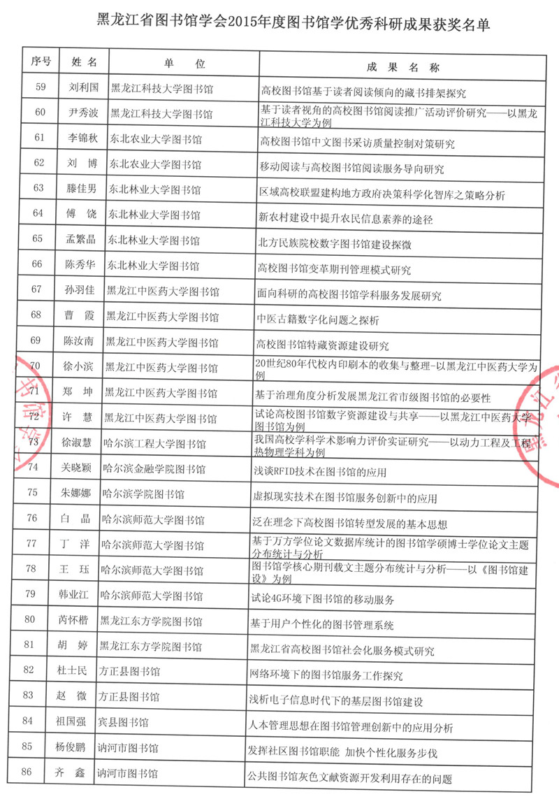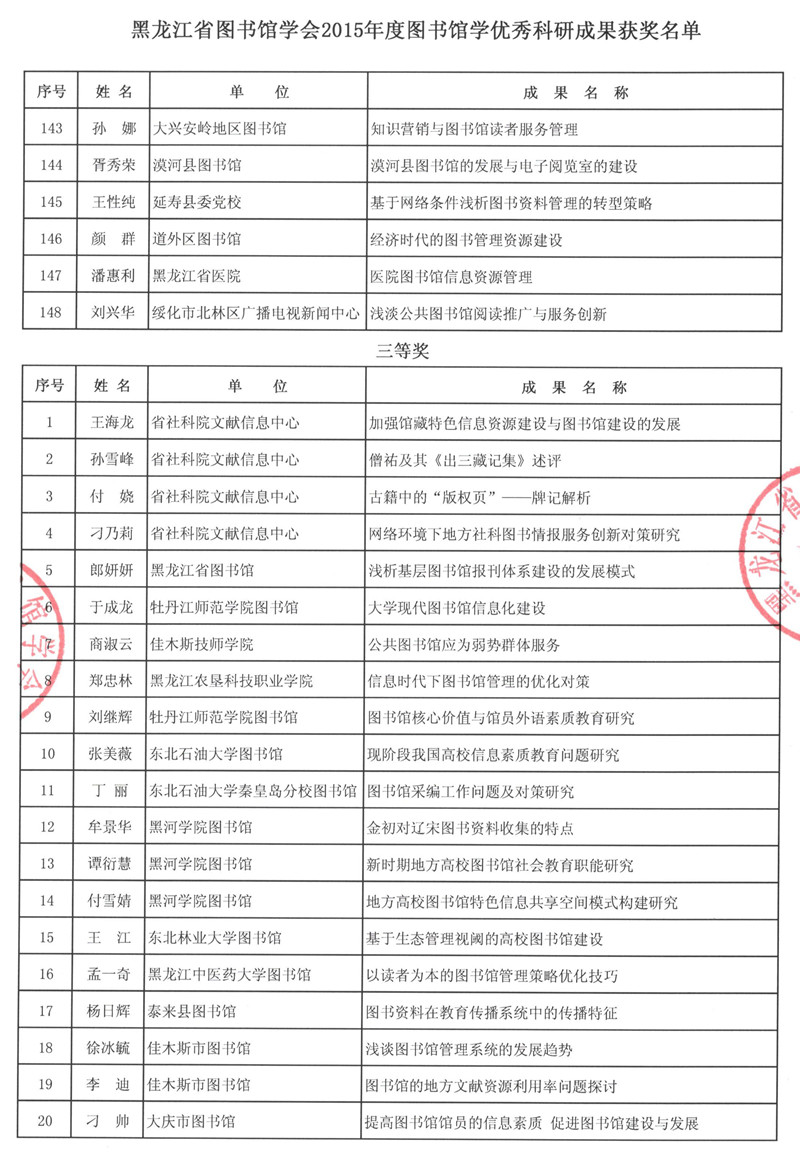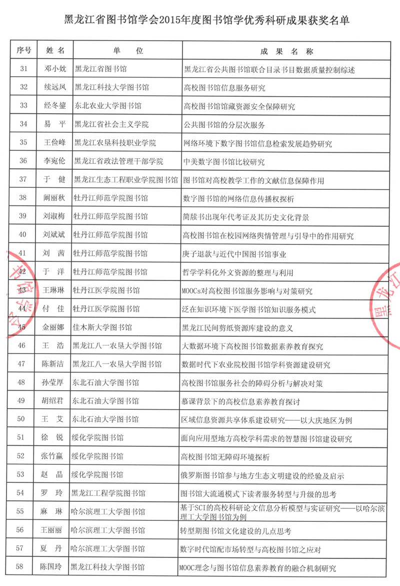 黑龙江省图书馆学会2015年度图书馆学优秀科研成果获奖结果公布