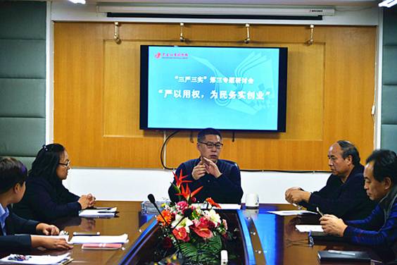 会上省图书馆党委书记高文华同志首先传达了省文化厅关于转发中共中央组织部组通字【2015】41号文件《中共中央组织部关于深化县级“三严三实”专题教育着力解决基层干部不作为乱作为等损害群众利益问题的通知》的内容。并结合文件精神将建立不作为、乱作为台账向与会人员进行了高度要求。随后党办主任郭涵同志传达了《关于深化县级“三严三实”专题教育开展基层干部不作为乱作为等损害群众利益问题专项整治的工作方案》的具体任务安排。馆领导班子成员分别围绕“严以用权,为民务实创业”进行了发言讨论,从领悟“严以用权”重大意义和丰富内涵、深刻认识“不严不实”危害到切实践行“三严三实”要求进行了全面深入的讲解和阐述。
