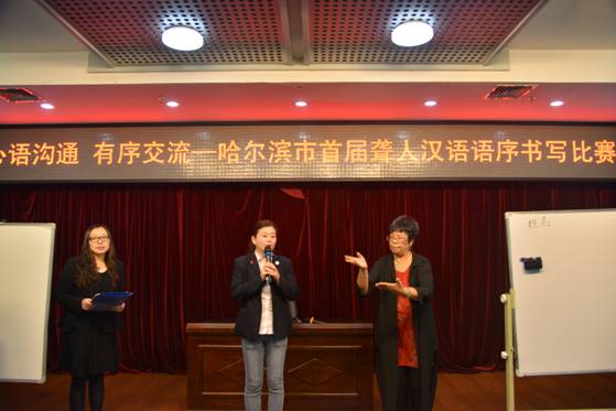 比赛当天由哈尔滨市各个区县残联选送的10位聋人选手参赛,选手们俩人一组通过手语老师打出的信息按照正确的中文文法书写出句子,以积分赛的形式角逐出一等奖一名,二等奖两名,三等奖三名。