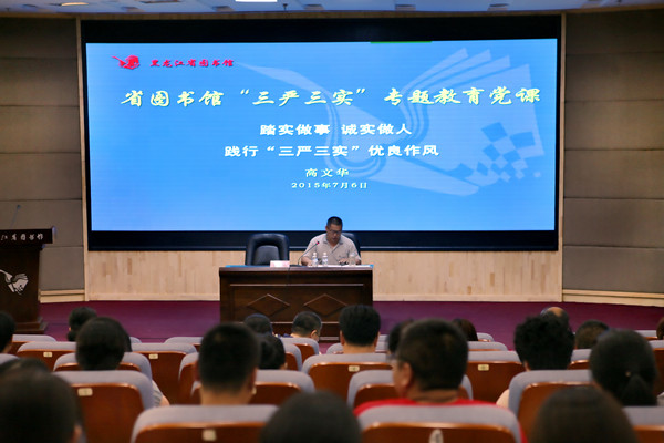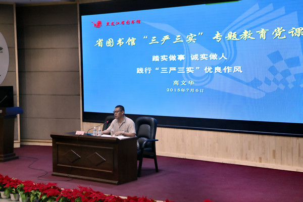 高文华书记理论联系实际,围绕“踏实做事、诚实做人”中践行“三严三实”优良作风为主线展开授课,深刻揭示“三严三实”的丰富内涵,并结合近些年馆党委的政治理论学习、省图文化事业发展,以中华民族传统文化为切入点,逐条逐项为全体党员干部解读了“三严三实”具体要求,语言平实,认识深刻,从自身出发,以学习的心态对照“三严三实”找差距、找问题,与大家沟通交流。授课过程中,高书记强调“三严三实”专题教育活动是党的群众路线教育活动的深化和推进,是每一位共产党员都应具备的基本修养,一定要把开展“三严三实”专题教育融入到党员领导干部的日常学习中去,在加强政治思想学习中践行“三严三实”,把“三严三实”作为正心修身的重要守则、干事创业的行动准则,要求每一位党员领导干部都以“三严三实”为标尺,着力解决“不严不实”问题,争做“三严三实”的好干部、好党员。