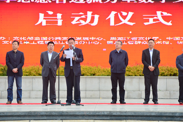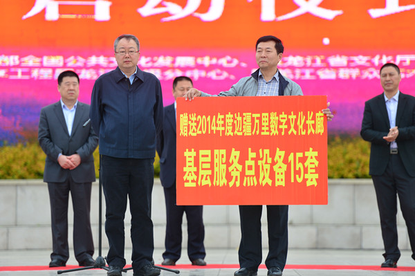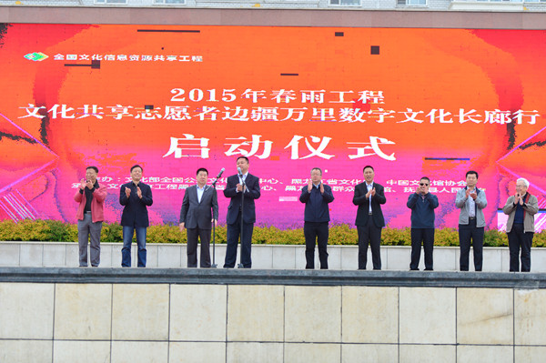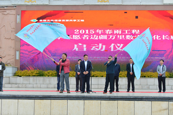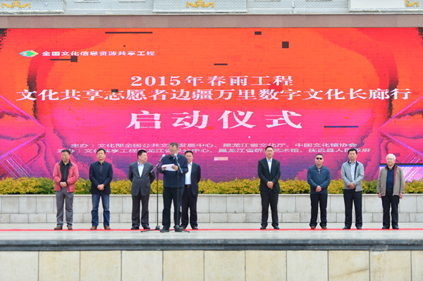 启动仪式由黑龙江省文化厅公共文化处副处长万征主持。仪式开始,抚远县副县长史盛茂致欢迎辞,表达了抚远县政府对于此项工作的高度重视和大力支持。黑龙江省文化厅副厅长韩慧峰讲话,他提到:黑龙江省边疆万里数字文化长廊建设用三年的时间,全面建成覆盖全省边疆县、乡、村与农场、林场、边防驻军部队、武警消防部队、武警边防部队、海关口岸、边贸集市、机场车站等传播广泛的现代公共数字文化服务体系。希望以‘2015春雨工程’为出发点,继续有效地宣传和推动文化共享工程建设与服务,更好地弘扬社会主义文化主旋律。”文化部全国公共文化发展中心副主任李建军讲话,他代表国家中心对我省边疆万里数字文化长廊工作给予高度认可,对文化志愿者边疆万里数字文化长廊行活动提出规划和展望,并向文化共享工程黑龙江省分中心主任、省图书馆馆长高文华,省群众艺术馆馆长李春盛授活动旗帜。文化志愿者的旗帜以“祖国的东极”抚远县为起点,分两路向下依次传递,走遍祖国的万里边疆,带着文化志愿服务的精神,春风化雨、润物无声的滋润边疆民族地区基层群众,最终实现在海南的胜利会师。