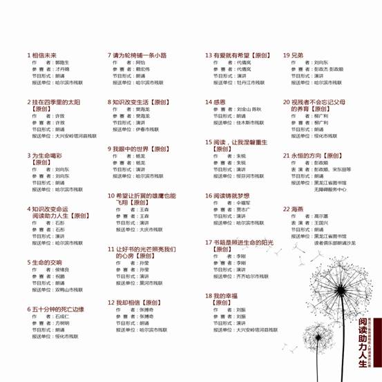为促进学习型社会与边疆文化大省建设,不断推动残疾人文化事业发展,营造书香龙江、全民阅读氛围,让积极健康的文化生活成为残疾人生活的一部分,充分展现龙江残疾人自强不息、热爱生活的良好精神风貌,在第23个国际残疾人日来临之际,省残疾人联合会与省文化厅决定,举办全省“阅读助力人生”第一届残疾人朗诵演讲大赛。活动由省残疾人联合会、省文化厅主办,市残联协办,黑龙江省图书馆承办。比赛历时一个月时间,分三个阶段进行: