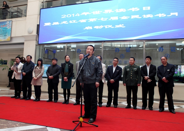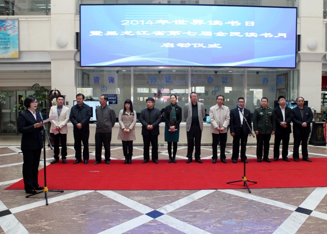 2014年4月23日上午9点30分,2014年世界读书日暨第七届全民读书月启动仪式在黑龙江省图书馆主楼大厅举行,省委宣传部、省文化厅、省军区、省文明办、省社科联、省妇联、共青团黑龙江省委、大庆市文联、哈尔滨电视台的相关领导及省市各媒体、社会各界读者出席。启动仪式由黑龙江省图书馆副馆长毕洪秋主持,黑龙江省文化厅副厅长韩慧峰致辞,致辞中提到:我省自2008年以来以世界读书日为契机,每年在全省范围内开展为期一个月的全民读书月活动。在省图书馆的倡议下,全省各级公共图书馆都组织开展了一系列主题鲜明、形式多样、内容丰富、贴近百姓的阅读活动,在引领风尚、教育人民、服务社会、推动发展等方面发挥了重要作用。