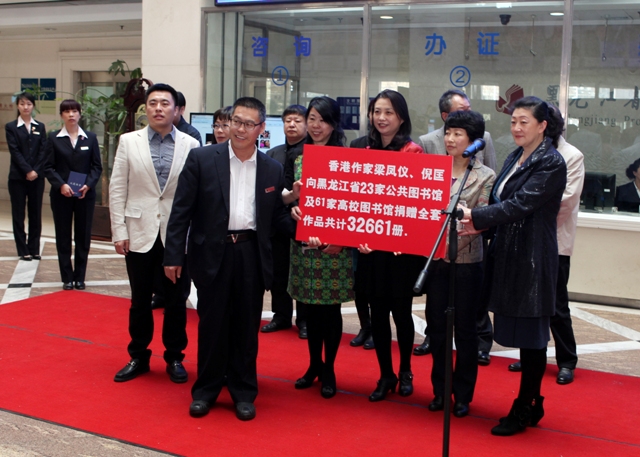 仪式上,香港著名作家梁凤仪女士、倪匡先生委托哈尔滨电视台“都市直通车”栏目组向我省23所公共图书馆和61所高校图书馆捐赠了其全套代表作品,共计191套,32661册,黑龙江省图书馆、哈尔滨工业大学图书馆等六家单位代表上台接受了捐赠图书。