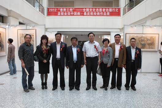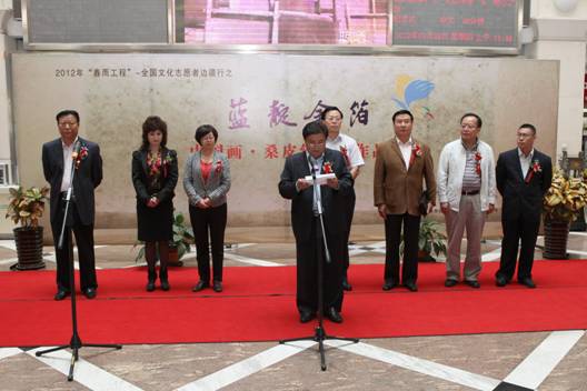 由新疆维吾尔自治区人民政府主办,文化部公共文化司、新疆维吾尔自治区文化厅、黑龙江省文化厅承办,新疆维吾尔自治区文化馆、黑龙江省群众艺术馆、黑龙江省图书馆联合协办的2012“春雨工程”全国文化志愿者边疆行之蓝靛金箔中国画?桑皮纸绘画作品展于2012年9月6日上午在黑龙江省图书馆隆重举行。黑龙江省文化厅党组书记、厅长宋宏伟,新疆维吾尔自治区文化厅厅长阿不力孜?阿不都热依木等相关领导,部分书画家,摄影爱好者及到馆读者150余人参加了开幕式。