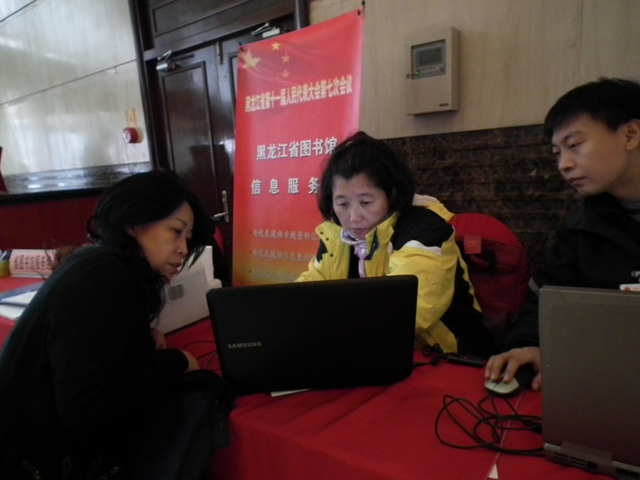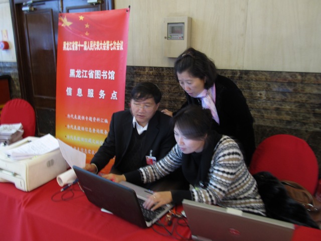 哈尔滨代表团的高广生代表,去年关于《黑龙江省食品安全条例》的提案就是省图书馆工作人员帮助其完善的,并成为2011年的一号议案。今年特意来到省图信息服务点表示感谢。同时要我们帮助其补充有关《黑龙江省社会保障服务体系》的新提案。工作人员通过网络查询和馆内文献传递,很快解决了问题。绥化的王亚军代表,要了解有关城市化和现代化农业的专题资料,咨询人员利用一上午时间就把专题汇编递到他手中,王代表对查询结果非常满意,说没想到这么快就到手了。除代表外,黑龙江画报社的孙先生和人大办公厅的张女士等媒体记者和工作人员,也利用我馆的服务平台为后方及时发回报道。