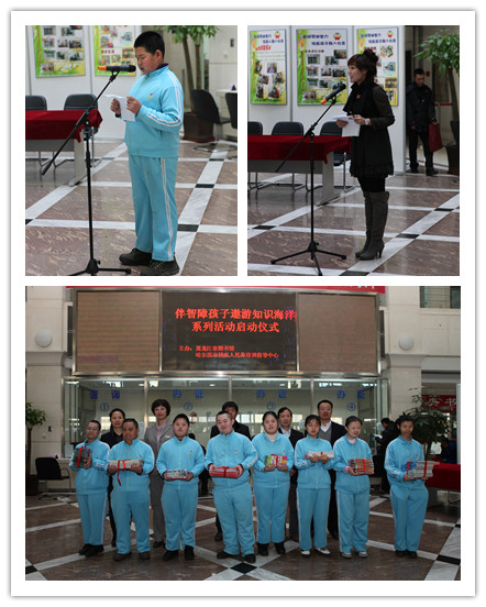 “图书伴智障孩子遨游知识海洋”启动仪式今天上午在我馆隆重举行。市残疾人联合会副理事长于滨宣布了“图书伴智障孩子遨游知识海洋”系列活动正式启动;黑龙江省图书馆副馆长刘继维在启动仪式上致辞;智障学员代表表达了对社会各界无限关爱的感激之情。